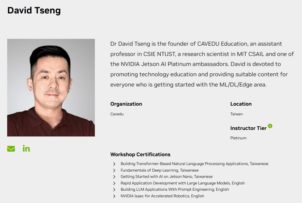 曾吉弘 (阿吉老師):從 2022 年開始取得 NVIDIA 認證講師資格,至今每年榮登 NVIDIA DLI AI 白金級大使。2025 年排行全球第一!