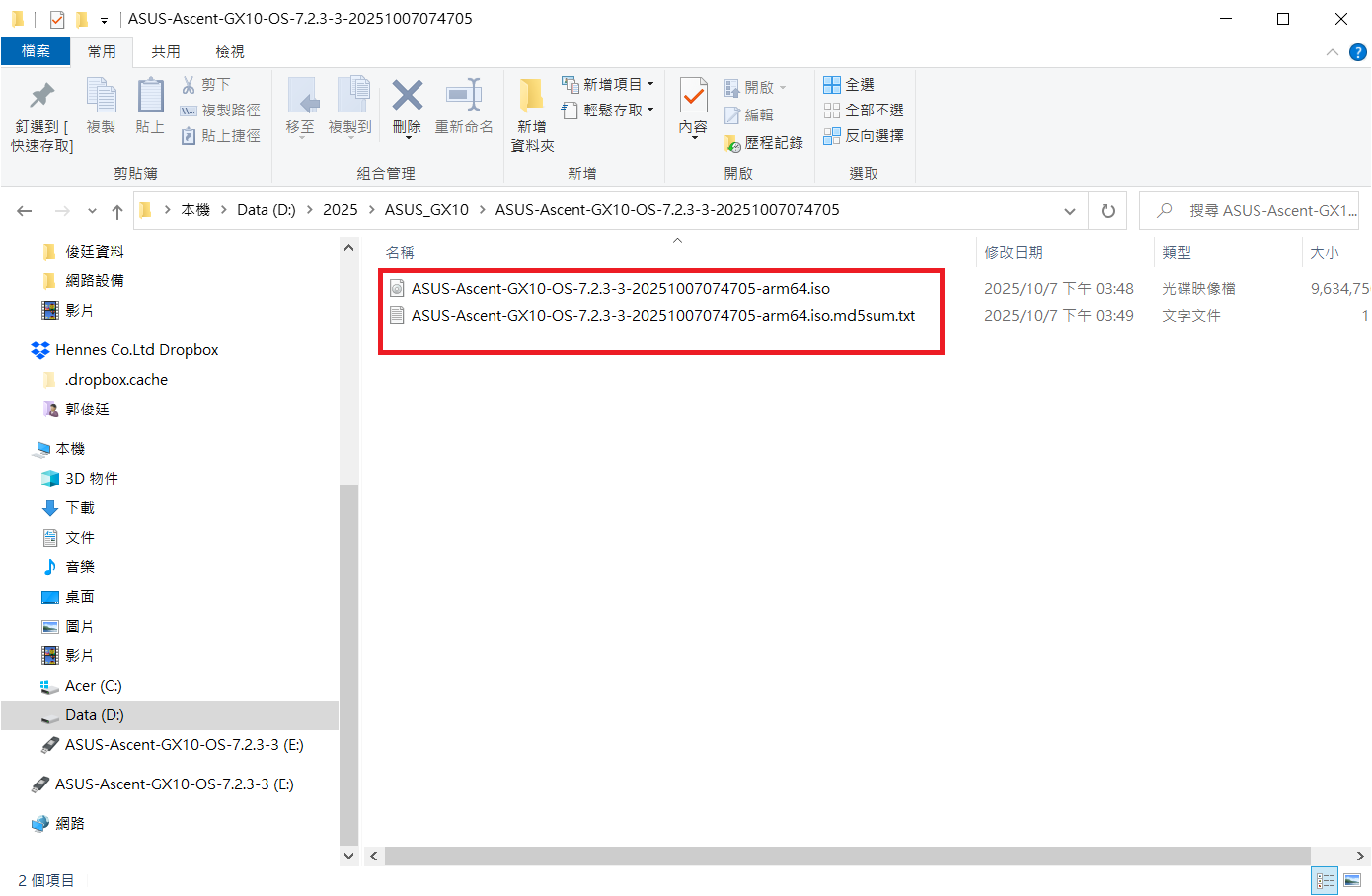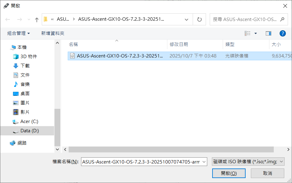 ASUS-Ascent-GX10-OS-7.2.3-3-20251007074705.tar.zip)。此檔案需要使用如 7-Zip 等工具進行多次解壓縮,直到獲得最終的.iso映像檔。