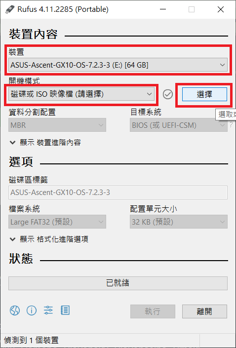 1.啟動 Rufus 軟體,並依序進行以下設定: