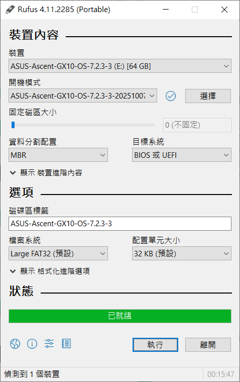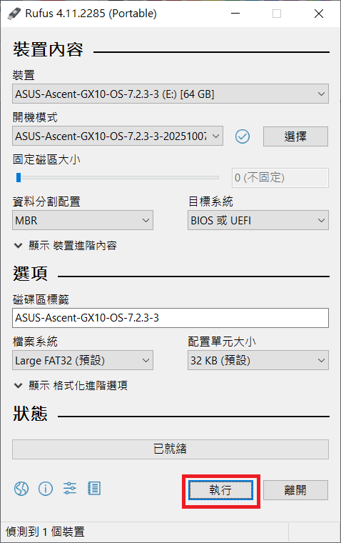 6.當狀態顯示為「已就緒」時,表示開機碟製作完成,可以進行後續的系統安裝。
