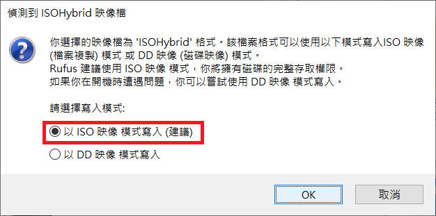 3.當跳出「偵測到 ISOHybrid 映像檔」提示時,請選擇「以 ISO 映像模式寫入 (建議)」並點擊 OK。