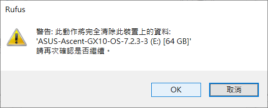 4.接下來軟體會發出警告,提醒此操作將清除隨身碟上所有資料。請務必確認已備份所有重要資料,然後點擊 OK 繼續。