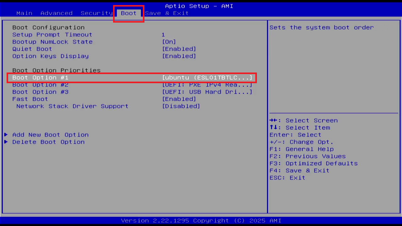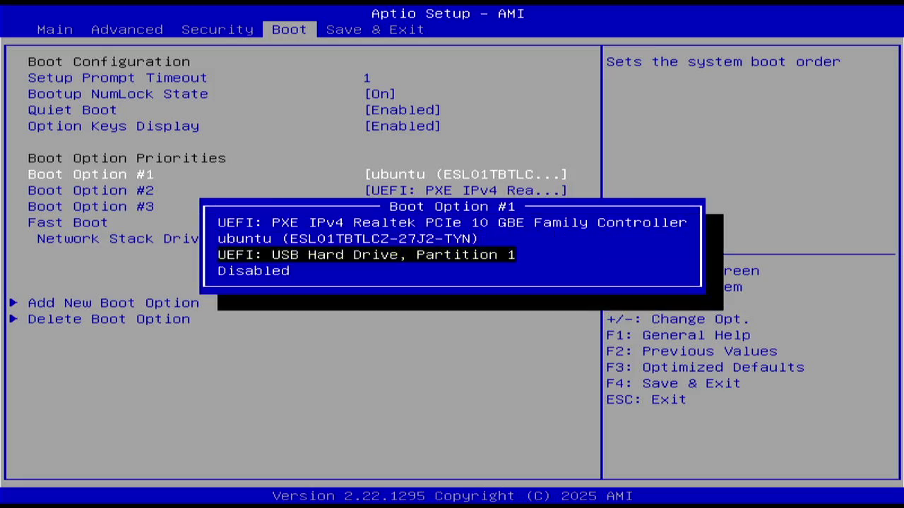 - 將選項更改為您製作的 USB 隨身碟,名稱應顯示為 [UEFI: USB USB Hard Drive, Partition 1],以確保機台能從 USB 裝置開機。