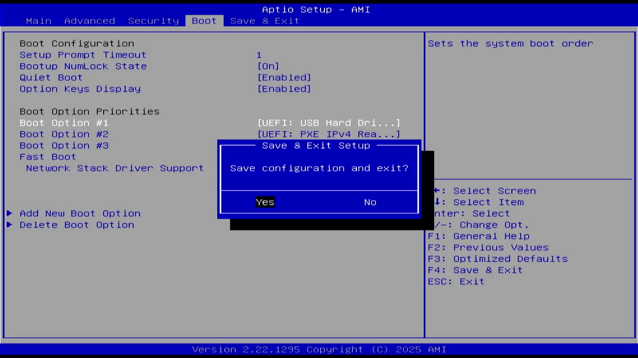 - 在跳出的「Save configuration and exit?」提示視窗中,選擇 [Yes] 儲存變更並重新啟動系統。
