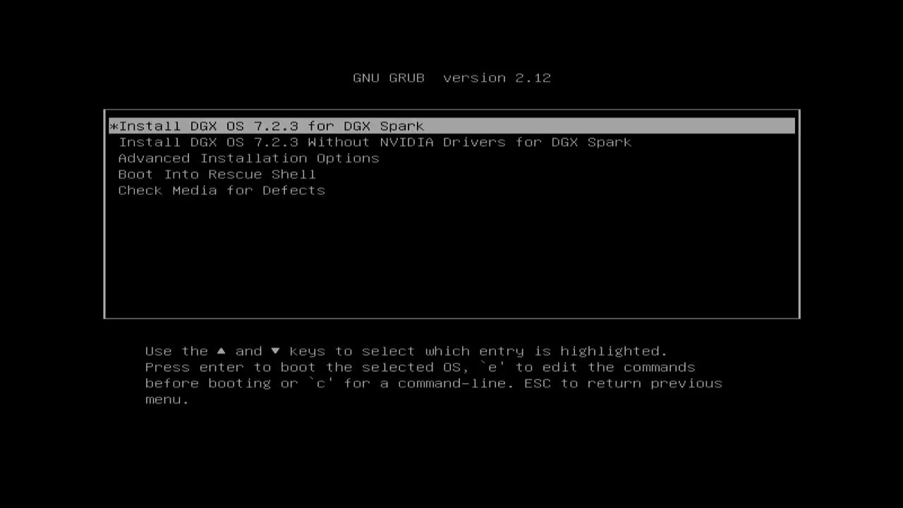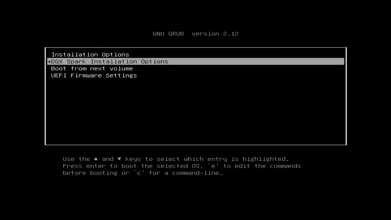 - 系統重新開機後將進入 GNU GRUB 開機選單。請選擇 [DGX Spark Installation Options]。